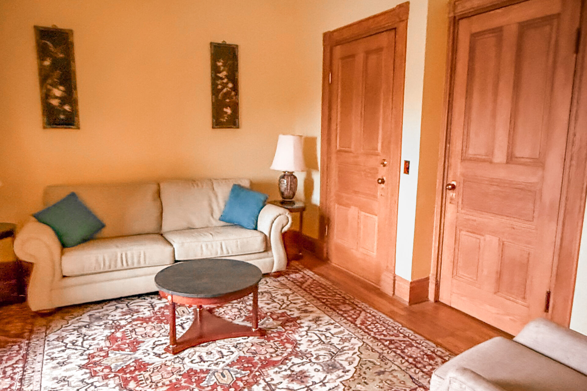 Spacious suite with campus-side views, antique furnishings, and modern amenities, offering comfort and historical appeal.