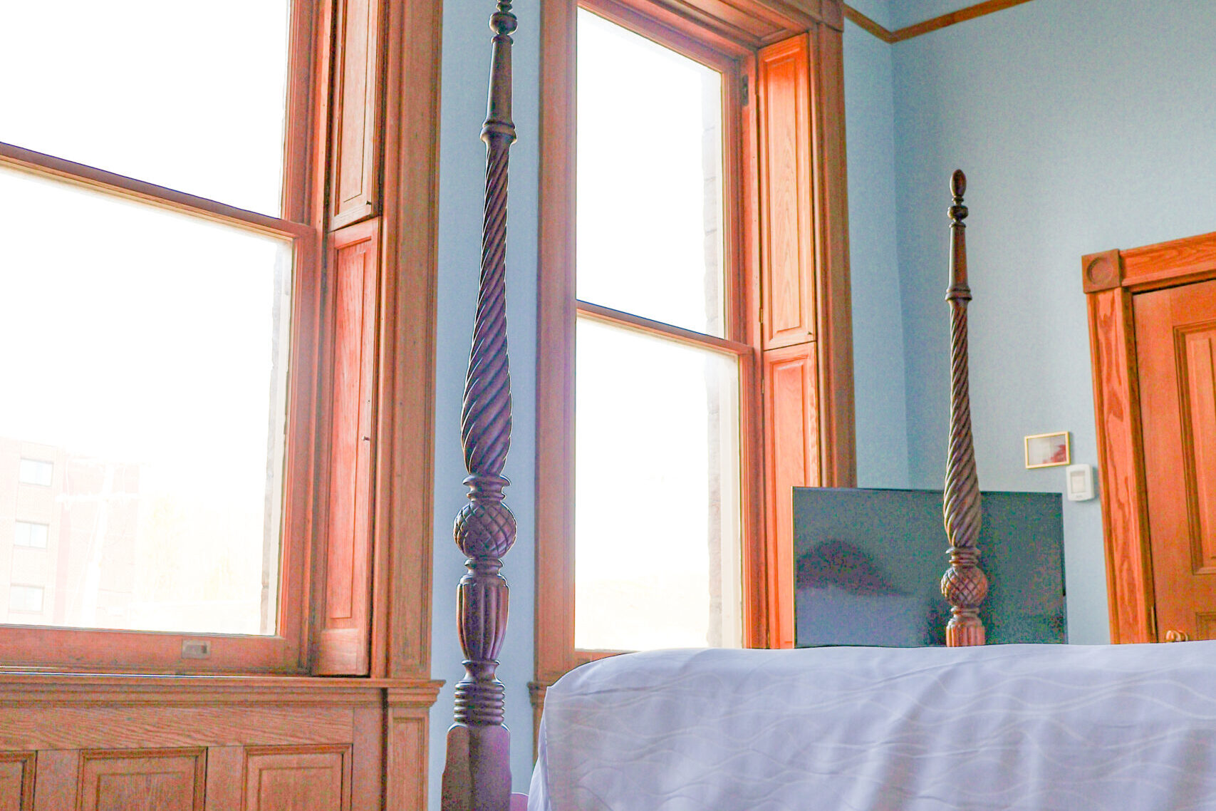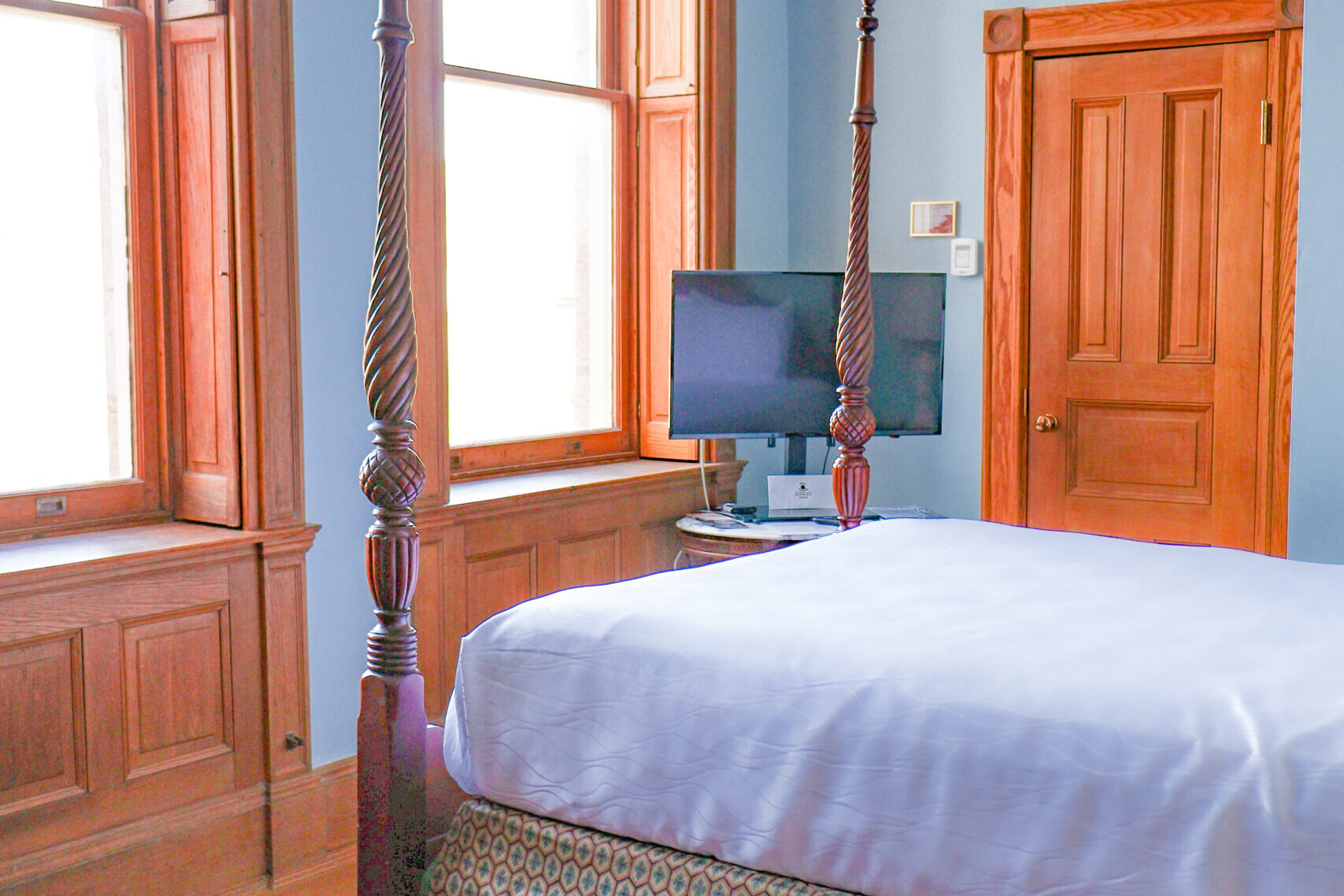 Historic room with a queen bed, blending classic charm and modern comforts, offering a cozy, relaxing atmosphere.