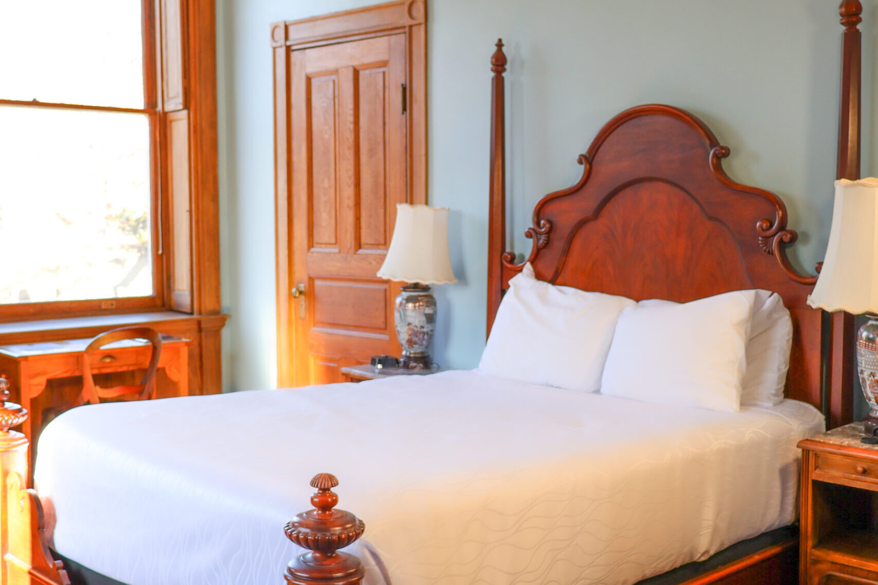 Historic room with a queen bed, blending classic charm and modern comforts, offering a cozy, relaxing atmosphere.